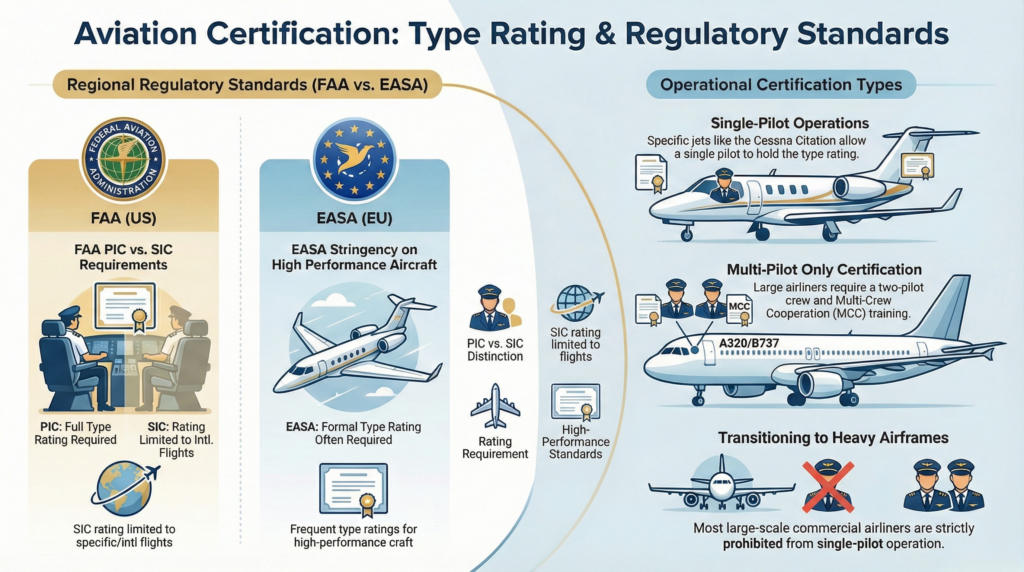 In the United States, the FAA focuses heavily on the distinction between PIC (Pilot in Command) and SIC (Second in Command). While the PIC always needs the full type rating, the SIC only needs a “SIC Type Rating” for international flights or specific crew requirements.
