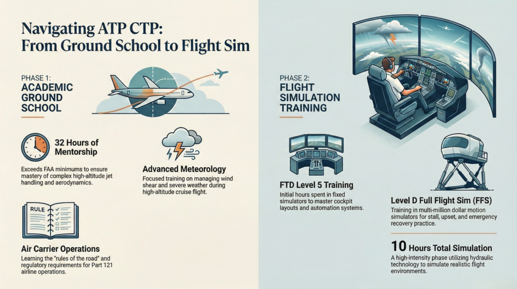 - Ground School: Classroom instruction on high-altitude aerodynamics, weather, and air carrier operations.