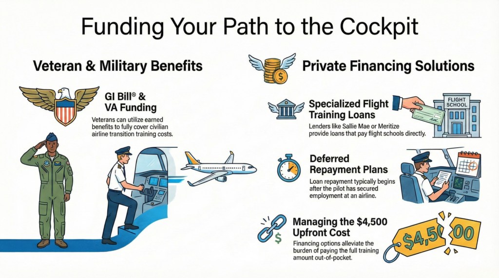 Veterans can often use their benefits to cover the cost of training. This is a popular route for military pilots transitioning to civilian airlines.
